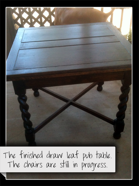 The sitting area on the patio in the back of the house has been coming along nicely.  I've finished my project of stripping and refinishing the antique draw leaf pub table.  It's so beautiful that I want it in the house, but there's no room.  Besides, it was in such poor condition when I bought it that I had no problems thinking it would live on the patio.  My concession to it's beauty will be a custom cover that will protect it from the rain (if we ever get out of this drought!).